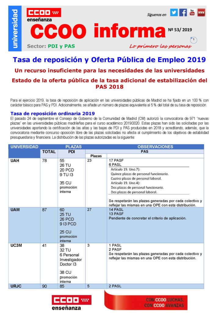 Aunque los responsables de la Comunidad de Madrid (CM) pretenden presentar el cumplimiento estricto de su propia Ley de Presupuestos como un ejemplo de su compromiso con las Universidades y los servicios públicos, CCOO recuerda que las plazas autorizadas (971) no son más que un parche insuficiente ante la pérdida de plantilla en las Universidades Públicas de Madrid desde el curso 2009/2010.