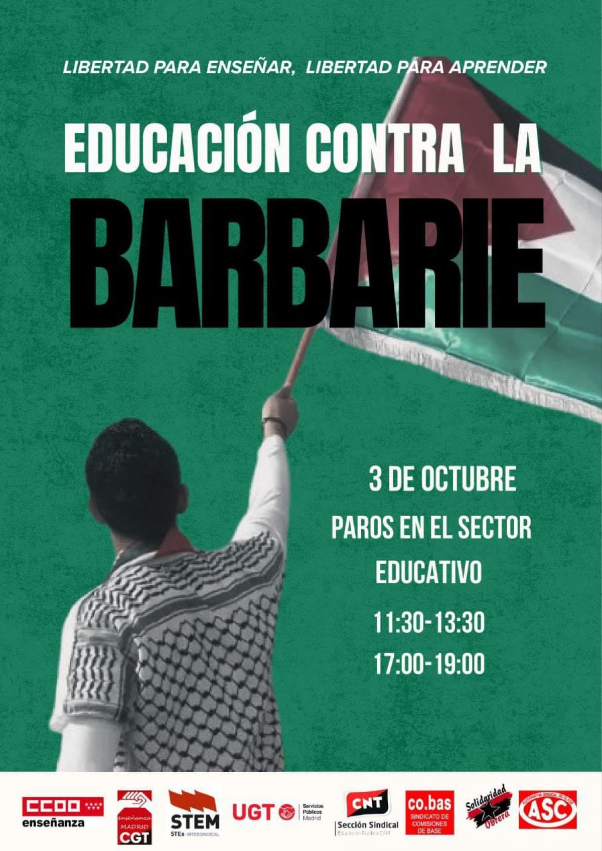 Por eso, como preludio a la GRAN MANIFESTACIÓN que tendrá lugar el sábado 4 en Madrid, desde CCOO te convocamos a secundar los PAROS laborales en el sector educativo que hemos convocado las organizaciones sindicales para este viernes 3 de octubre, de 11:30 a 13:30 y de 17 a 19 h.
