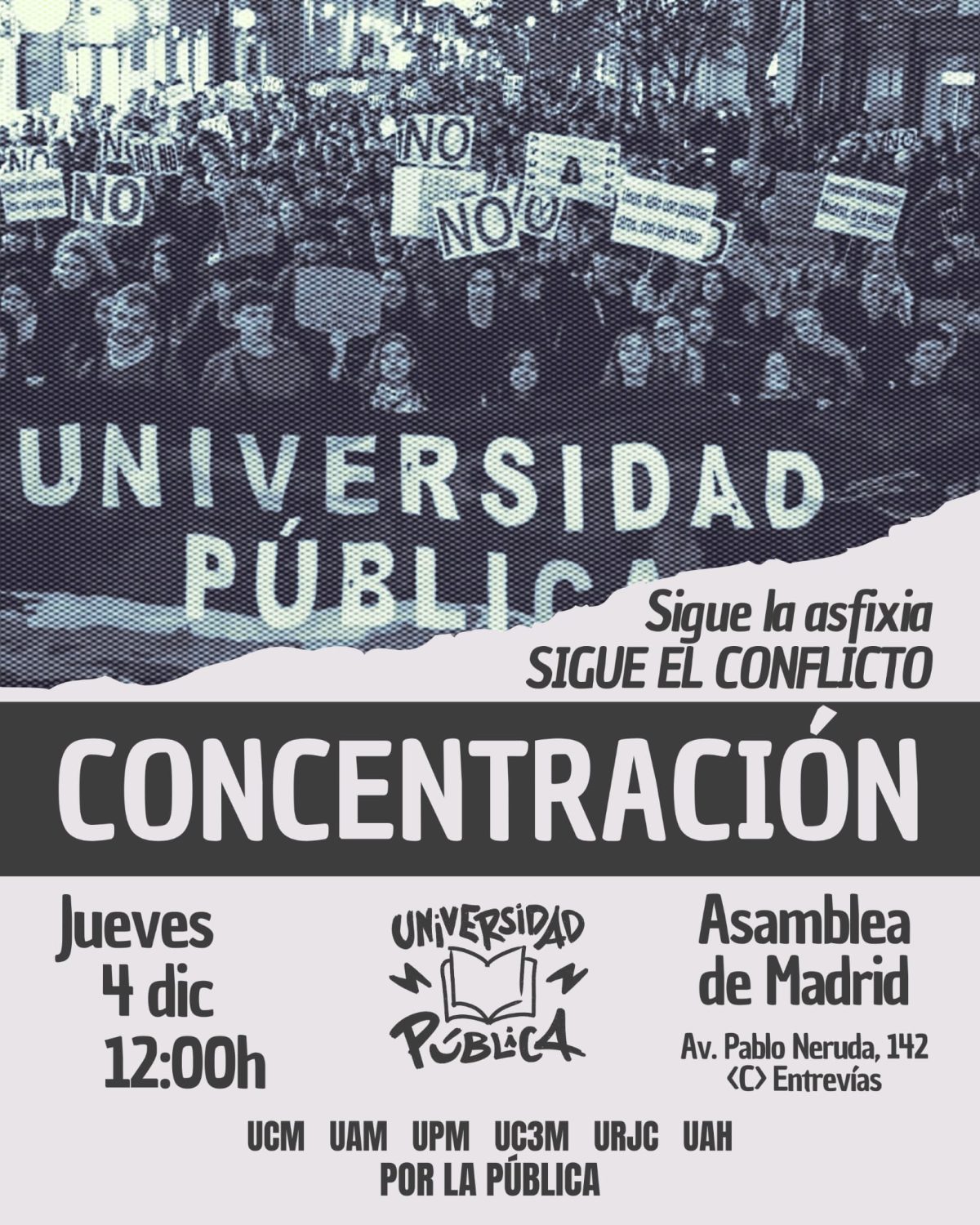 Así pues, el próximo 4 de diciembre, a las 12:00 horas, te convocamos a la ASAMBLEA de trabajadores y trabajadoras ante la sede de la Asamblea de la Comunidad de Madrid, donde aprovecharemos el debate de los presupuestos para seguir reivindicando una financiación justa y adecuada a las necesidades reales de nuestra universidad pública.
